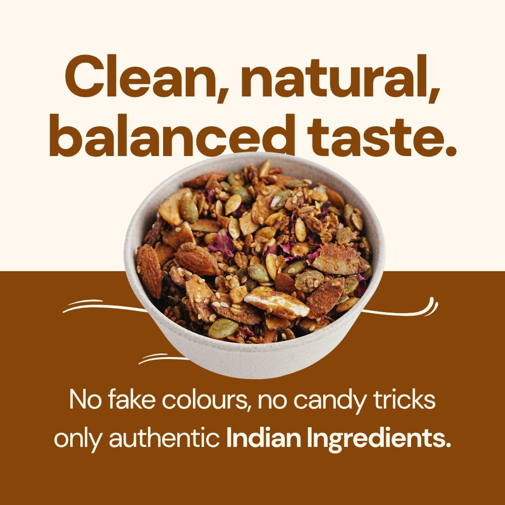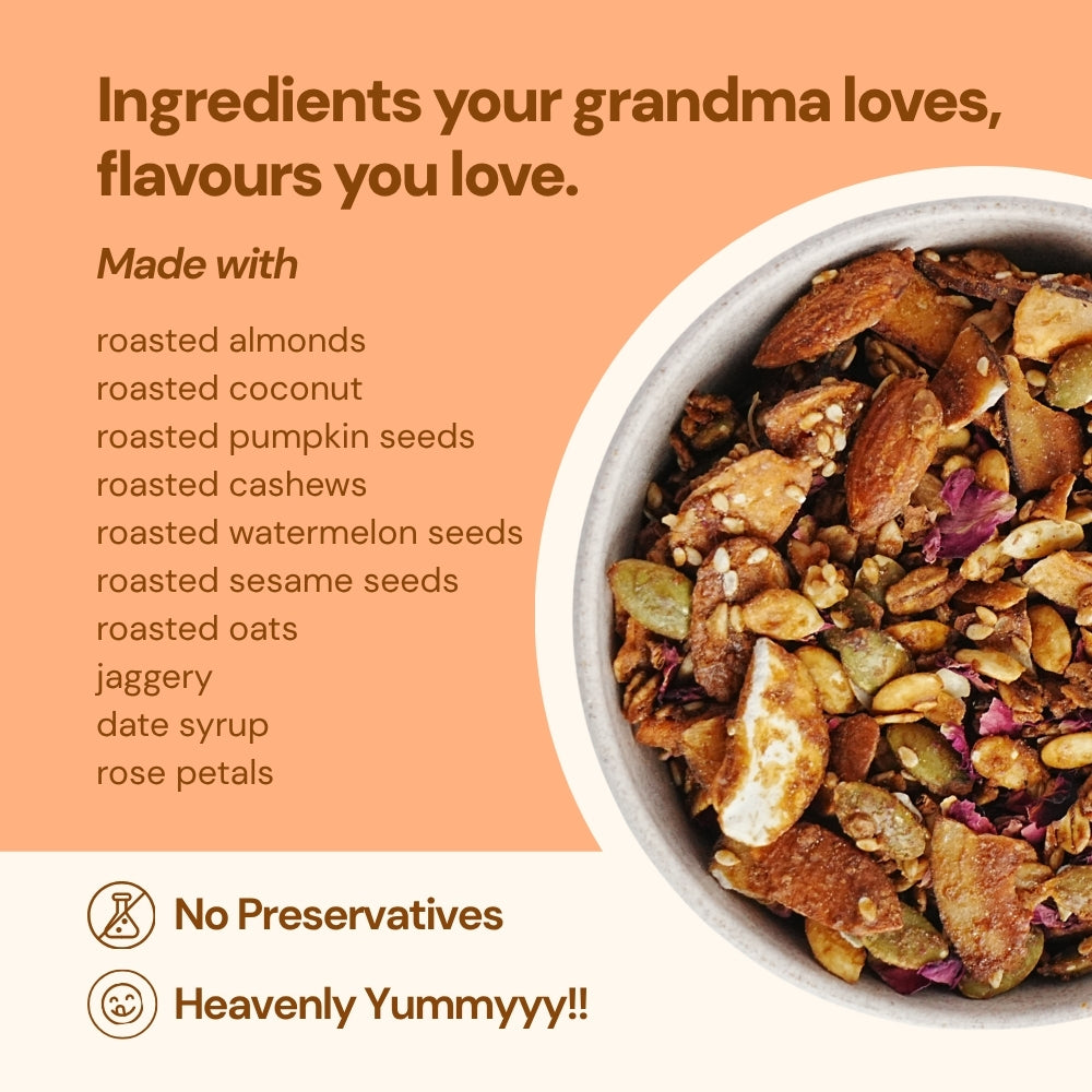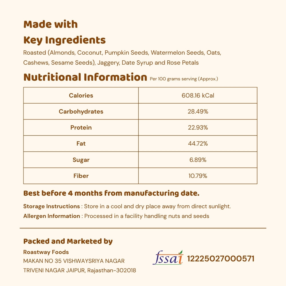 Roasted Almonds, Coconut, Pumpkin Seeds, Watermelon Seeds, Oats, Cashews, Sesame Seeds, Jaggery, Date Syrup, Rose Petals.