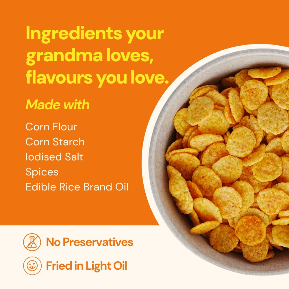 Corn Flour, Tapioca Starch, Iodised Salt, Spices, Edible Rice Bran Oil.