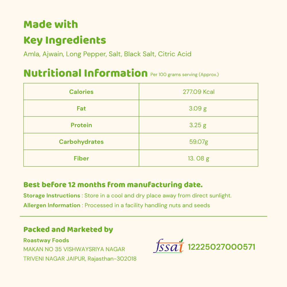 Ingredients: Amla, Ajwain, Long Pepper, Salt, Black Salt, Citric Acid.