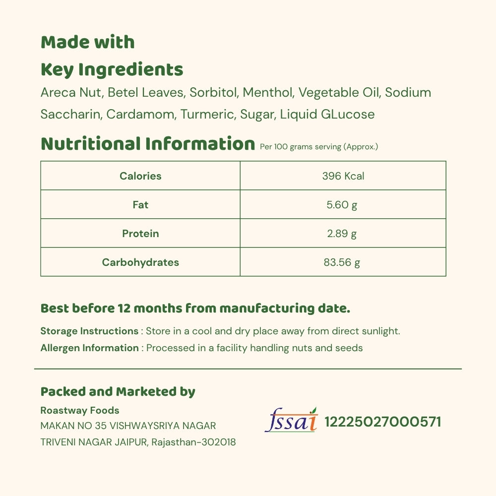 Made from real betel leaves, cardamom, turmeric, and menthol, this mukhwas brings together tradition and freshness in every spoonful.