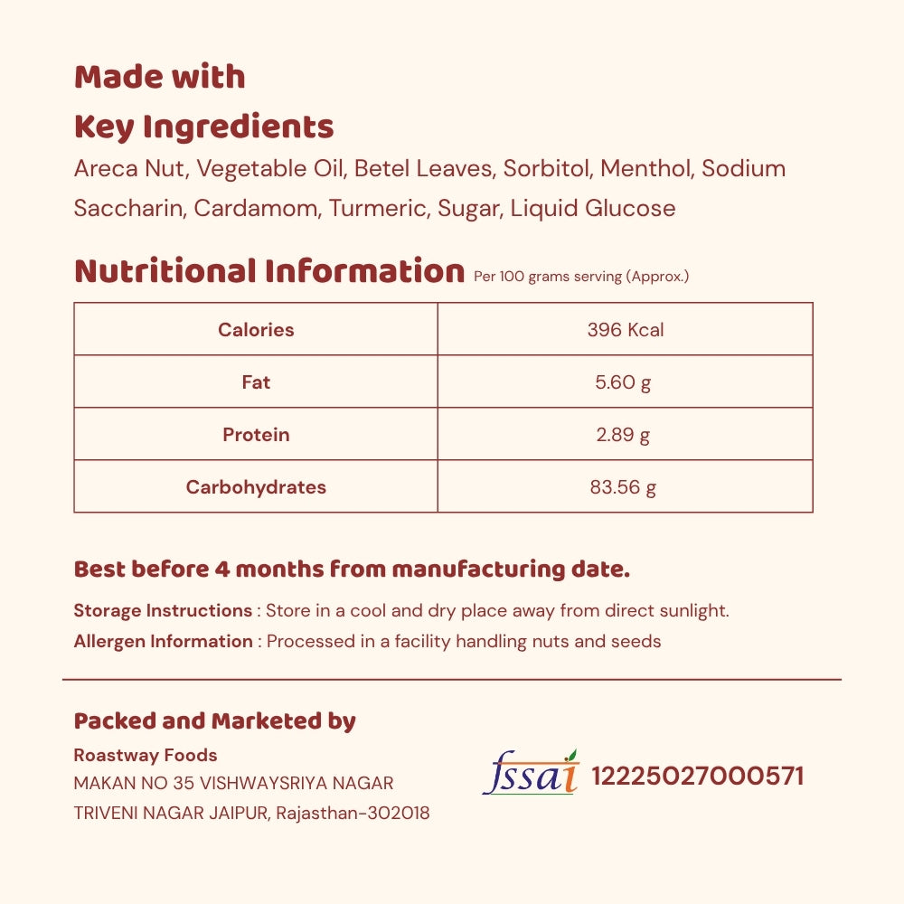 Areca Nut, Vegetable Oil, Betel Leaves, Sorbitol, Menthol, Sodium Saccharin, Cardamom, Turmeric, Sugar, Liquid Glucose.