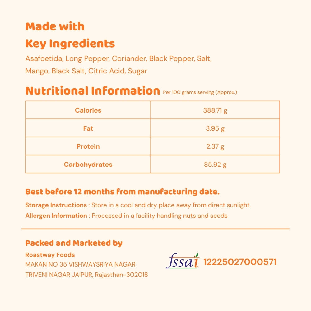 Asafoetida, Long Pepper, Coriander, Black Pepper, Salt, Mango, Black Salt, Citric Acid, Sugar.