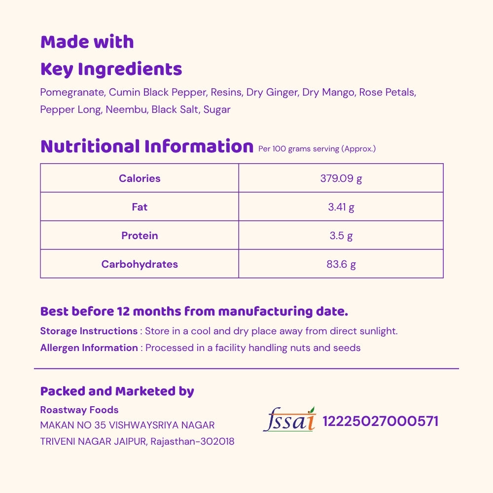 Pomegranate, Cumin, Black Pepper, Raisins, Dry Ginger, Dry Mango, Rose Petals, Long Pepper, Neem, Black Salt, Sugar.