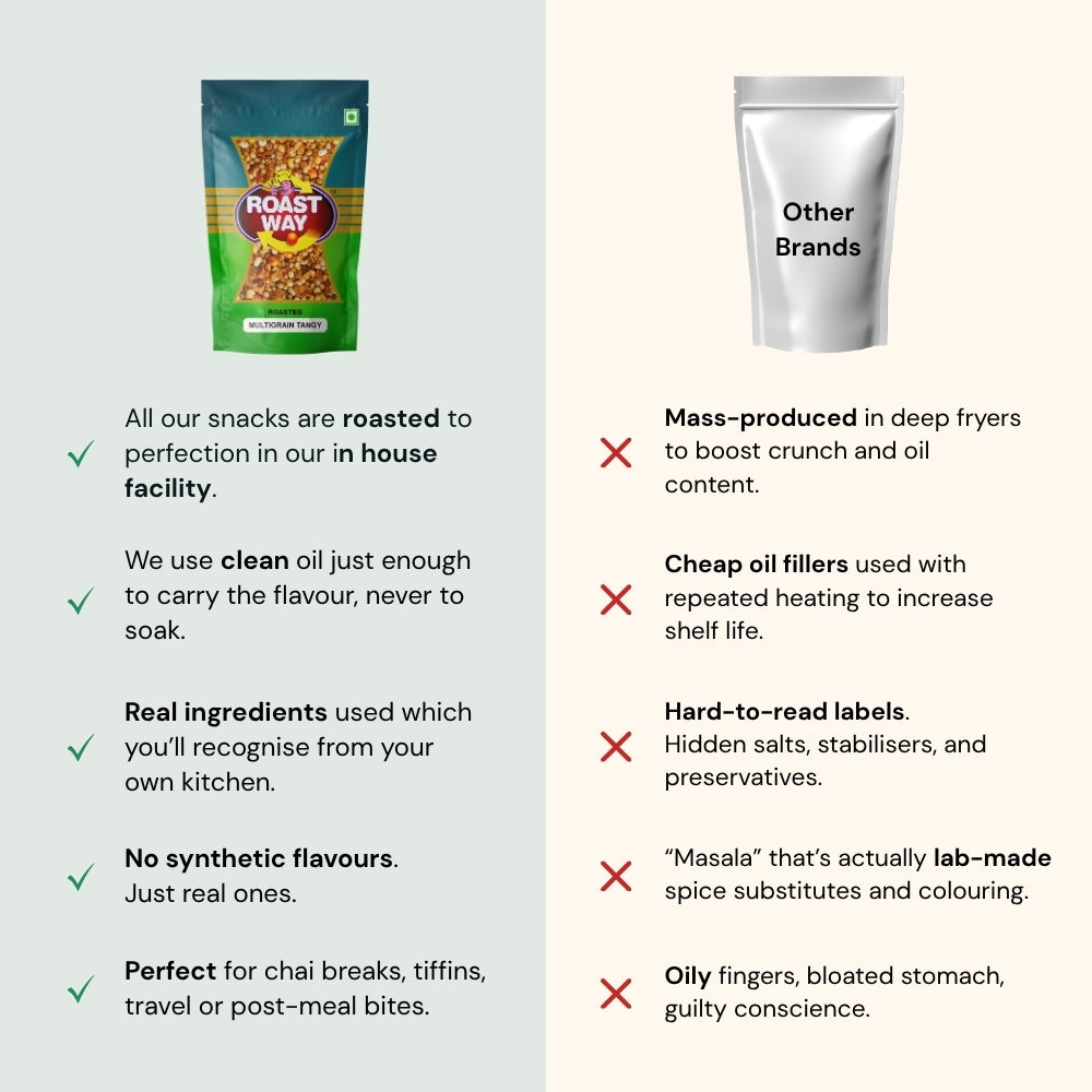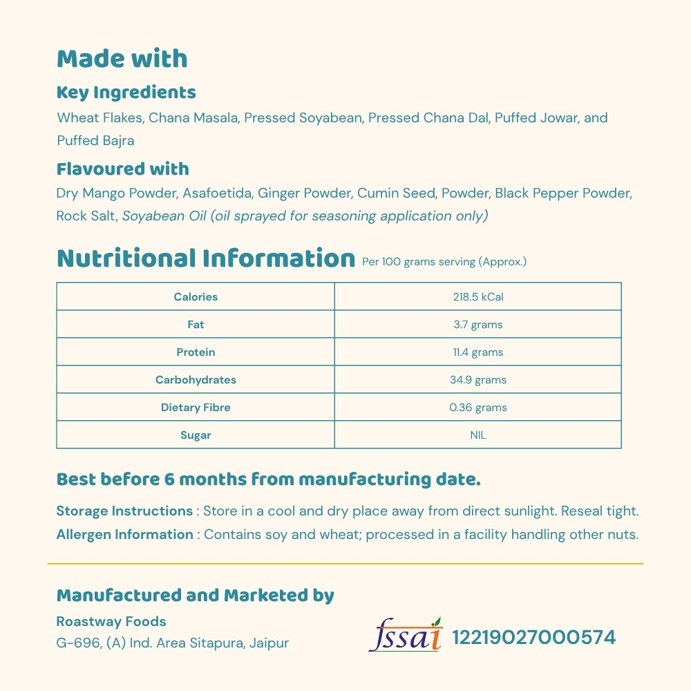 Our Multigrain Tangy is a wholesome 6-in-1 roasted namkeen made with wheat flakes, puffed jowar, bajra, soyabean, chana dal and chana masala. Every grain is roasted, not fried, so you get the satisfying crunch without the heaviness of oil.