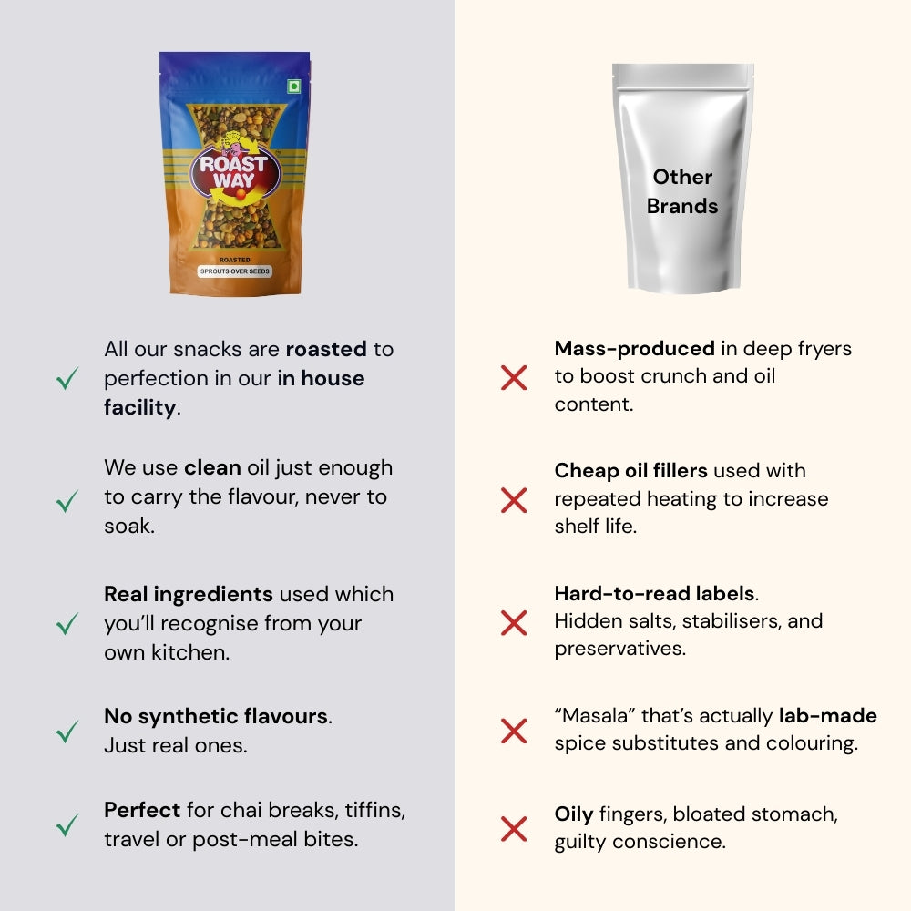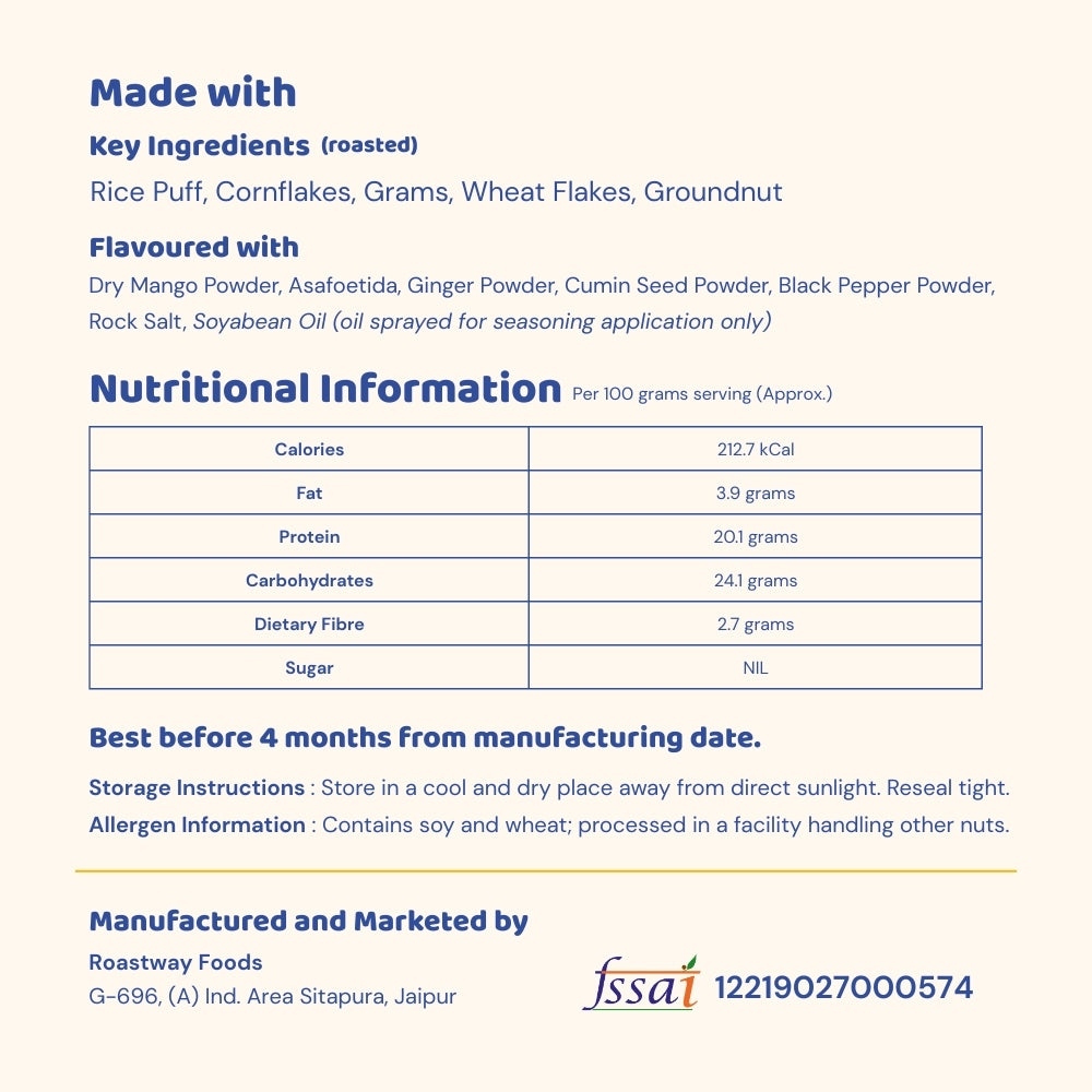 Ingredients: Moong, Soyabean, Moth, Masoor, Chana, Pumpkin Seed, Watermelon Seeds, Dry Mango Powder, Asafoetida, Ginger, Cumin Seed, Black Pepper, & other relevant spices. (veg. oil sprayed for seasoning application only).